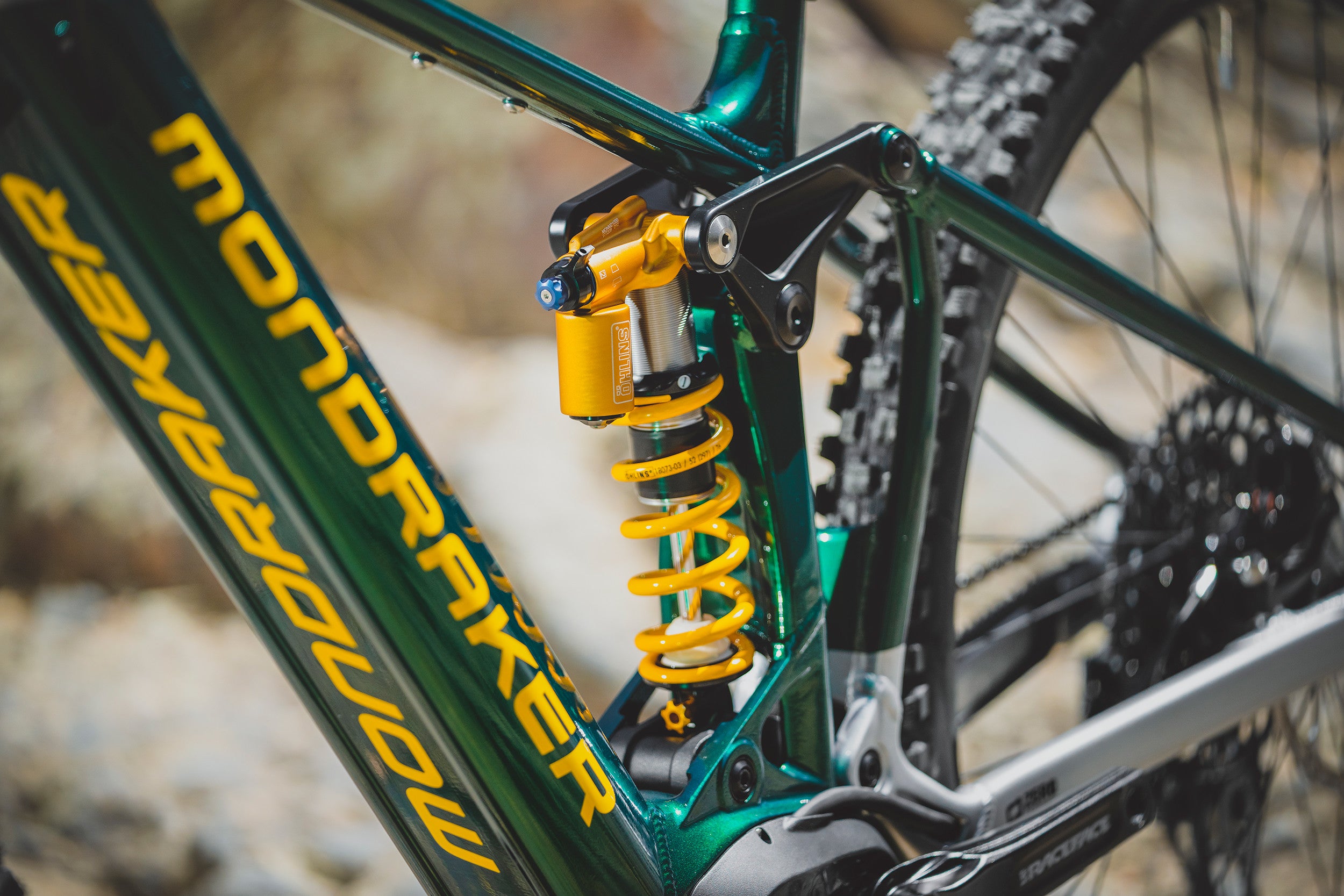 Öhlins TTX Air 205x65mm. Settings: high speed compression lever with climb mode, low-speed compression, rebound, air preload. Trunnion top mount, 30x8mm bottom bushings